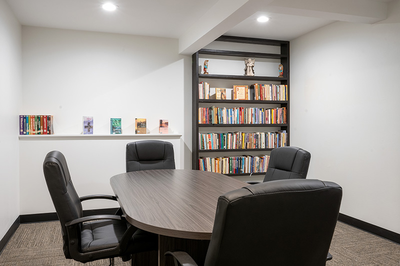 A small conference room and library are located on either side with tables and seating for quiet time or small group gatherings.